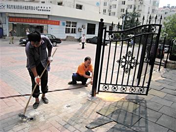????昨天上午,當(dāng)市北城管執(zhí)法局清違中隊(duì)與街道辦事處工作人員出現(xiàn)在現(xiàn)場,幾名工人用氣割工具,一會(huì)工夫就將兩面黑色柵欄全部拆除,隨后,又將地面留下的殘留部分用水泥補(bǔ)齊,以免傷人。市北城管執(zhí)法人員告訴記者,他們接到居民舉報(bào)后,前往幼兒園調(diào)查時(shí),幼兒園已經(jīng)豎起了三面圍欄,不僅圈占了近300平方米的公共場地,而且鏟掉了一塊大約50平方米的綠地,架設(shè)了兒童娛樂設(shè)施。因?yàn)槟貌怀鰧徟掷m(xù),他們多次責(zé)令整改,但執(zhí)法人員走后幼兒園又繼續(xù)開工。