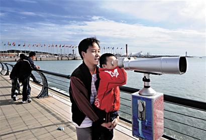 昨日,一位父親帶著孩子在青島奧帆中心內(nèi)遠(yuǎn)眺