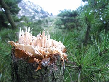 ????葛師傅告訴記者,從前些天開始,他就留意到山坡路邊出現(xiàn)成片被人攔腰砍斷的松樹?!澳嵌际蔷W(wǎng)鳥的不法分子為飛鳥設(shè)下的陷阱?!备饚煾嫡f,遷徙的飛鳥一般都是貼山脊飛行,不法分子利用飛鳥的這個(gè)習(xí)性,把山脊的樹叢攔腰砍倒一片,然后在這個(gè)“空當(dāng)”架起大網(wǎng),飛鳥覺著這片樹林比較低,就會飛進(jìn)來自投羅網(wǎng)。下午1時(shí)許,記者根據(jù)葛師傅的指引,從銀川西路上山,沿山間小路走了半個(gè)多小時(shí),就看到多棵被攔腰砍斷的松樹,為掩蓋剛砍斷的新茬,有人還特意在上面蓋了枯草。