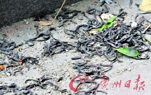 ????有街道清潔人員告訴記者,從前天開始就已發(fā)現(xiàn)不斷有蚯蚓爬出,但昨天驟然增多,自己也在不斷清掃中。在附近某小區(qū)居住的謝小姐表示,即使在小區(qū)的路上,走幾步就能看見(jiàn)蚯蚓,不是已經(jīng)死亡,就是在緩慢爬行?!盎钪挠衅甙死迕组L(zhǎng),死的就沒(méi)有那么長(zhǎng)了”。