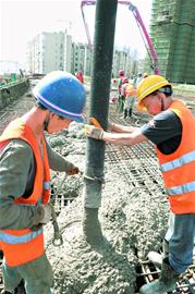 ????云南路主線高架共有6聯(lián)主橋。昨天開始澆筑的是云南路主線高架1號橋,也是最緊鄰快速路三期的一聯(lián)橋。記者上午11點趕到作業(yè)現(xiàn)場,工人們正在進行第3層混凝土澆筑。4名工人引導(dǎo)兩臺泵車通過導(dǎo)管向箱梁澆筑混凝土,流出的混凝土被工人迅速導(dǎo)入箱梁中,隨后再被振搗機均勻下引,確保澆筑的密實度。據(jù)項目相關(guān)負責人介紹,整個澆筑作業(yè)分6層進行,每層澆筑混凝土30-40厘米,24小時將澆筑混凝土1280立方米。作業(yè)完成后,箱梁厚度將達到2米。