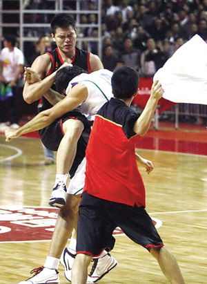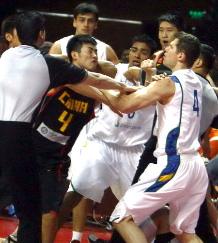 ????但此事件卻同時(shí)點(diǎn)燃了雙方的火氣,在隨后的一次防守中,丁錦輝與郭艾倫連續(xù)犯規(guī),而且動(dòng)作都比較大。巴西隊(duì)則以牙還牙,在中國隊(duì)進(jìn)攻時(shí)的籃下?lián)屛恢校?號(hào)球員與朱芳雨糾纏到了一塊兒,盡管裁判判罰對(duì)方9號(hào)犯規(guī),但“朱8”此時(shí)已經(jīng)于對(duì)方開始互相推搡,在場球員也紛紛圍攏過來,大規(guī)模沖突正式開始。