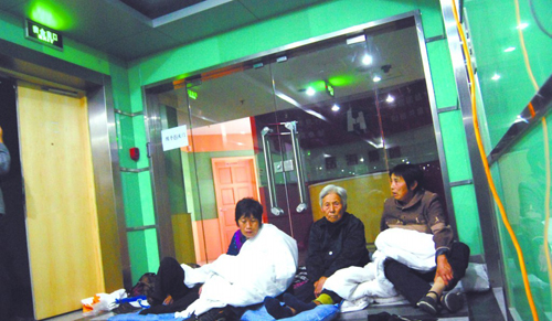????當(dāng)天下午4時(shí)許,當(dāng)記者來(lái)到該大廈16樓看到,在該層辦公的一家建筑公司兩扇大門緊鎖著,玻璃大門外的地上放著兩床被褥,5位老人和一名年輕女子蜷縮在被窩里。被褥旁邊放著大包小包的行李,不遠(yuǎn)處的插座旁放著一個(gè)電磁爐,對(duì)面的墻根下放著米、水以及鍋碗瓢盆等,在一側(cè)的大門旁邊還放著幾杯從外邊購(gòu)買回來(lái)的豆?jié){。