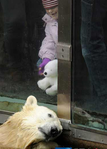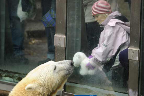 ??? 據法新社和《每日電訊報》報道,德國柏林一家動物園的北極熊“納特”不幸被園中同伴排擠欺負,卻在一個小女孩手中的玩具小熊身上找到同胞愛。