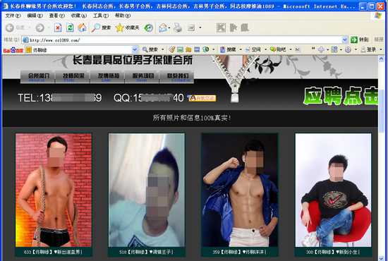 ????繼2009年11月本報(bào)推出《長(zhǎng)春男男賣淫黑幕大揭秘》系列調(diào)查報(bào)道后,今年10月初開(kāi)始,本報(bào)記者歷時(shí)半個(gè)月臥底男男賣淫群體組織內(nèi)部,通過(guò)成功應(yīng)聘賣淫男當(dāng)“少爺”,全程直擊應(yīng)聘、被點(diǎn)臺(tái)、出臺(tái)、交易等過(guò)程,揭開(kāi)了男男賣淫組織的行業(yè)內(nèi)幕。男男賣淫組織利用網(wǎng)上會(huì)所招攬生意,通過(guò)招聘擴(kuò)大從事賣淫男群體,整個(gè)交易行為的灰“色”暴利吸引越來(lái)越多的男性加入賣淫群體,知情行內(nèi)人透露,性服務(wù)男技師比“小姐”更吃香。經(jīng)過(guò)前期周密策劃準(zhǔn)備,暗訪調(diào)查組成員之一化名為“天天”的記者準(zhǔn)備應(yīng)聘男技師。