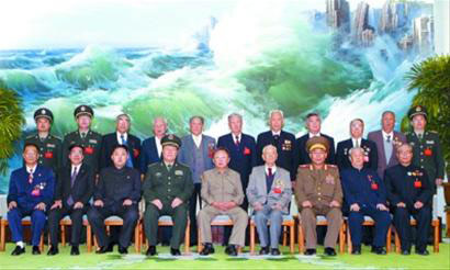 ????金正日(左五)、金正恩(左三)、中共中央軍委副主席郭伯雄(左四)與中國志愿軍老戰(zhàn)士代表團(tuán)成員合影。