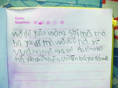 ????一年級女兒第一篇“拼音日記”讓母親淚流滿面久勤 萬凌云本報訊 剛上一年級的女兒卉卉(化名)睡熟了,家住鎮(zhèn)江桃花塢新村的王女士,無意中看到了女兒寫的第一篇日記,當(dāng)看到用漢語拼音拼出的日記的第一句竟然是“我的愿望是媽媽不要打罵我”時,想到自己“盼女成鳳”心切而對女兒的“嚴(yán)格”教育,王女士忍不住淚流滿面。昨天,卉卉父親給記者講述了女兒日記惹哭母親的故事。
