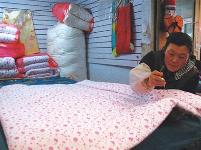????雖說商場超市“瞧不上”傳統(tǒng)的老棉被,但市場需求還挺旺盛。記者在大連路農(nóng)貿(mào)市場紡織品銷售區(qū)看到,有幾家銷售棉布的攤位在現(xiàn)場加工制作老棉被?!懊薇幌啾绕渌牧系谋蛔樱谥亓亢屯笟庑陨仙晕⒉铧c,但棉花是純天然產(chǎn)品,還是有不少市民喜歡。”在市場上縫了七八年被子的單女士告訴記者,中老年人是定做棉被的主要群體,另外還有部分結(jié)婚的年輕人,生意好的時候一天能接到近10筆訂單。