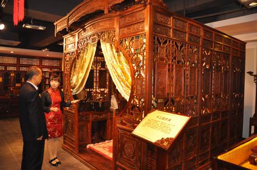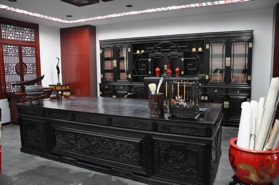 ????記者在大易紅坊看到了數(shù)件“鎮(zhèn)館之寶”:樹齡1000多年、最大直徑2.3米的非洲花梨木超大畫案;采用數(shù)噸上等老撾紅酸枝,精雕細(xì)琢而成的“千工拔步床”;有“東方神木”之稱的古沉木孔子造像;印度小葉紫檀頂箱柜和金絲楠木頂箱柜等。
