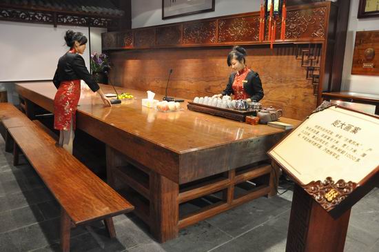 ????大易紅坊超大畫案材質(zhì)為非洲花梨,學(xué)名“古夷蘇木”,產(chǎn)地非洲加蓬。該畫案長7米,寬1.7米,厚0.23米,重達(dá)3噸。原木樹齡1000多年,最大直徑2.3米,且千年古樹不透不漏,乃世所罕見。