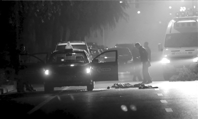 ????涉案的“比亞迪”出租車左前門和右側(cè)前后門均打開,車窗玻璃左側(cè)呈網(wǎng)狀破裂成洞,前燈都亮著。左前車門處的地面上有大量血跡和沾滿血跡的衛(wèi)生紙及幾件衣服,衣服周圍散落著玻璃碎片。車身左側(cè)從前門至車尾部有一條血痕。數(shù)十名警察對周邊進行了戒嚴。據(jù)相關(guān)技術(shù)人員分析,這條血痕有可能是傷者事發(fā)后,試圖追趕兇手時留下的,說明傷者當時的意識比較清楚。經(jīng)現(xiàn)場勘查鑒定,該車車窗玻璃上的破洞是子彈穿透人體后所致。2時30分左右,警方將這輛出租車拖離現(xiàn)場。