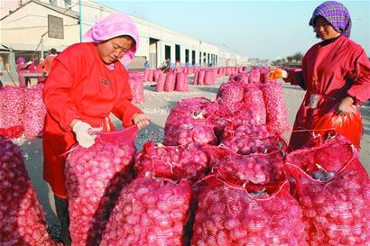 ????從金鄉(xiāng)縣城區(qū)向西行駛兩公里,便到達金鄉(xiāng)縣大蒜國際商貿城,寬闊的馬路兩側遍布囤積大蒜的冷庫及大蒜加工企業(yè)。在友緣公司門前空地上,工人們正在從冷庫中運出儲藏的大蒜,剝除大蒜最外側的老皮后,將其裝進紅色的編織袋中?!敖衲甓煳覀儍Σ亓?000多噸大蒜,這還不算儲藏最多的?!痹摴痉止車H貿易業(yè)務的劉成文經(jīng)理對記者說,離他們公司不遠的宏昌集團,今年存蒜高達兩萬多噸。