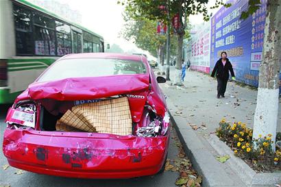 ????記者趕到事故現(xiàn)場(chǎng)時(shí),交警剛剛將路中間的事故車疏導(dǎo)到路邊,而體型較大的卡車因?yàn)檐嚀p較輕已經(jīng)獨(dú)立駛離了現(xiàn)場(chǎng),但是被它撞傷的車依次停在路邊,只見一輛紅色的私家車車后燈被撞碎,后廂已經(jīng)完全變形,車后蓋被撞成了 “麻花狀”?!拔耶?dāng)時(shí)正停在路口等紅燈,突然間轟的一聲后邊的車撞上了我的車,我趕緊拉手剎,結(jié)果隨后又是兩次撞擊,巨大的慣性讓我的車頂上了前面的車輛?!奔t色車的車主說。