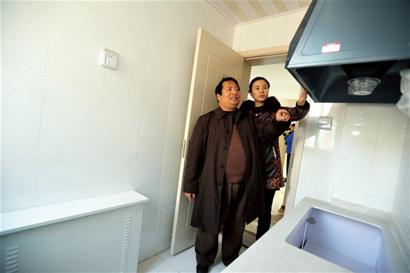 ????47歲的項(xiàng)本勝和妻子走進(jìn)9號(hào)樓一套三居室戶型,近50平方米的房間已經(jīng)完成精裝修,廚房、衛(wèi)生間地面和墻上都鋪好了瓷磚,客廳臥室地面鋪有復(fù)合地板?!斑@些灶具別的房子都有吧?!笨吹綇N房中的一體櫥柜、打火灶、吸排油煙機(jī),項(xiàng)本勝有點(diǎn)不相信廉租房會(huì)有這么齊全的設(shè)施,在得到工作人員的肯定回答后,兩口子樂(lè)得合不攏嘴。