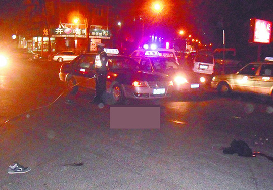 ????11月24日晚,記者接到報(bào)料后,立即趕到了事發(fā)地點(diǎn)。在華陽(yáng)路與營(yíng)口路交叉口,記者看到有一輛出租車,車頭朝西停在十字路口,前風(fēng)擋玻璃被撞碎,玻璃上還有很明顯的一個(gè)往里凹進(jìn)去的圓形痕跡,車頭處也有一小塊地方被撞得凹了進(jìn)去。在離出租車車頭前三米處,有一攤血,流出大約有一米長(zhǎng),一件深藍(lán)色上衣鋪放在地面的血跡上。記者趕到時(shí),血沒有凝固,還在流動(dòng),已經(jīng)淌出近一米遠(yuǎn)。在血跡的北側(cè)大概一兩米處,有一只運(yùn)動(dòng)鞋散落在那里,另外還有一只鞋子則散落在出租車附近。出租車兩側(cè)停了兩輛警車,周圍有很多群眾正在圍觀,多名警察正在現(xiàn)場(chǎng)進(jìn)行處理?!拔覀円彩莿傏s到現(xiàn)場(chǎng)不久,至于事情的經(jīng)過(guò)和起因我們也正在進(jìn)行調(diào)查了解?!爆F(xiàn)場(chǎng)一名警察告訴記者。