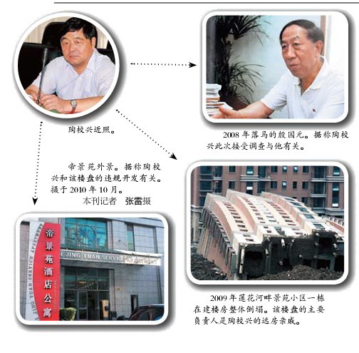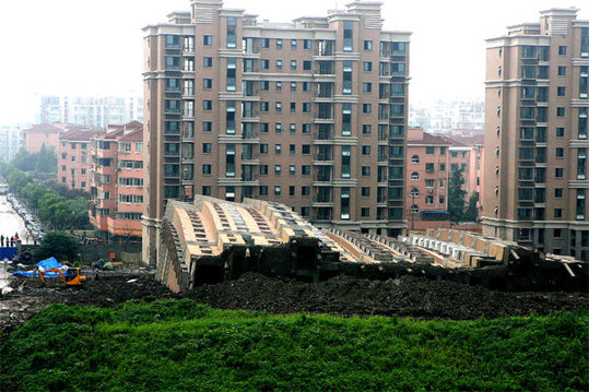 ????也有報(bào)道稱是因?yàn)樘招Ed在職期間,利用職權(quán)將上海市配套房建設(shè)項(xiàng)目工程打包給其親戚名下的公司操作。圖為蓮花河畔倒樓。(圖片來源:資料圖)