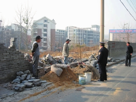????百余米的磚砌圍墻上開了個十多米長的大口子,地上的剎車痕跡清晰可見……5日上午,在淮安路一處工地外,工人們正在修補凌晨時分被大貨車撞倒的圍墻。