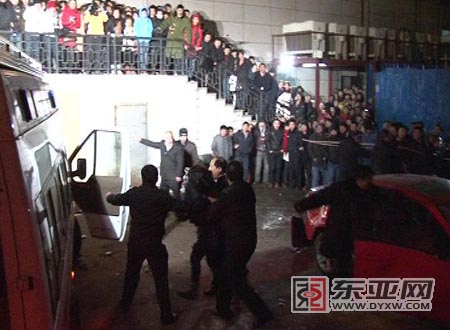 ????隨后又有幾位年輕男子朝“紅色馬六”踢去,還有人用拳頭砸車的風(fēng)擋玻璃:“你趕緊從車?yán)锍鰜?,大家都等著你道歉呢。”站在商場二樓圍欄觀看的市民朝“紅色馬六”轎車扔雪球,還有人扔磚頭、煙頭,民警忙著不斷勸大家不要情緒激動,一位民警頭部受創(chuàng)流血。