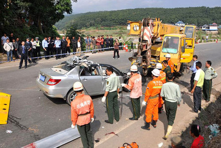 上午9時(shí)42分,景洪市景(景洪)大(大勐龍)二級(jí)公路18公里曼達(dá)糾村附近,一輛快速超車的比亞迪轎車撞上行駛中的一輛大吊車,導(dǎo)致車上的6名駕乘人員3死3傷。