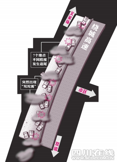 “事故如同大霧,來得很突然,我的傷算是輕的?!敝芟壬鷳c幸自己躲過一劫。上路之前,周先生就發(fā)現(xiàn)室外已經(jīng)起霧。當他駛近繞城高速路入口處時,他覺得霧并不是大的阻礙正常行駛,而高速管理路也沒有實施限行。懷著僥幸心理,周先生將車開上了繞城高速。但當其行駛至繞城高速路文家場至雙流段時,周先生發(fā)現(xiàn)車窗外的霧越來越大。