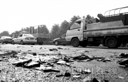 雖然只有了兩條車(chē)道能夠通行,但此時(shí)一旁的過(guò)路汽車(chē)還要注意地面上遍布的各種汽車(chē)碎片。