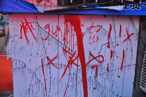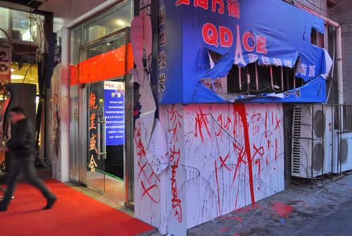 ????網(wǎng)友天下無戒在青島論壇發(fā)帖,標題為:《gun出青島!臺東街頭驚現(xiàn)史上最文盲恐嚇信》,貼文如下:早上去上班,臺東1路單位附近,看到一家眼鏡批發(fā)城前面聚滿了人,警察都去了。這家店的老板和店員正在門口氣得蹦高——原來,這家店的燈箱和門頭被其它賣眼鏡的同行砸壞了,還被潑上了油漆。更搞笑的是他們家門上被寫上了一封很短的恐嚇標語:gun出青島!×××××,是用紅色油漆寫的,書法水平很差,“滾”只寫了一半,好像不會寫了,就用拼音代替了。哈哈哈哈哈。笑得我肚子疼。那個老板顯然在附近住,厚衣服都沒穿就跑來了,頭發(fā)亂得像鳥窩,他鼻涕全下來了:“我就做個生意,東西賣低點,我招誰惹誰了。”他們家的店員也都抓狂了。這兩天我上下班都經(jīng)過這,他們剛開業(yè)三四天,去的人挺多,早上6點來鐘就有老頭老奶奶排隊,簡直跟不要命似的。 警察進去后,我在后面拍了幾張照片,讓大家見識一下。
