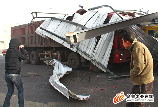 ????12月15日,烏魯木齊市區(qū)雖寒冷但陽光燦爛,然而在紅雁池水庫及烏拉泊片區(qū)則遭受到了大風(fēng)肆虐,對交通造成影響。部分車輛被刮翻,廠房房頂被掀開,天山大道附近的巨型廣告牌也遭到“毀容”。