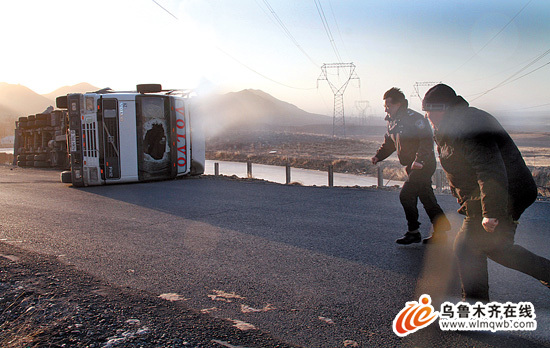 17時43分,在東過境公路,天山區(qū)交警大隊民警吐爾遜·阿吉(左)與哈薩克斯坦司機優(yōu)拉在大風(fēng)中艱難行走。當(dāng)日早上8時許,優(yōu)拉駕駛的一輛貨車被大風(fēng)吹翻在路邊。