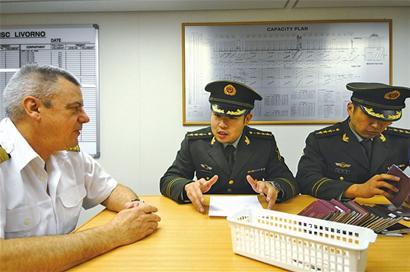 ????昨日上午,記者在前灣港82號泊位見到了 “地中?!だ譅栔Z”,并跟隨黃島邊檢站工作人員登船。據(jù)該船船長勒夫勒介紹,這艘貨輪隸屬于“地中?!焙竭\公司,德國籍。