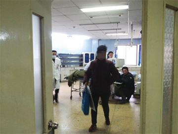 ????“醫(yī)院剛送進(jìn)來(lái)一個(gè)人,左腿血肉模糊,特別嚇人?!弊蛱焐衔?0時(shí),正在解放軍401醫(yī)院就診的市民張先生撥打早報(bào)熱線82888000報(bào)料,記者趕到401醫(yī)院,在急診室見(jiàn)到受傷的老邱,他躺在一張擔(dān)架床上,臉色異常蒼白,受傷的腿部被一床綠色的被子覆蓋,由于流血過(guò)多,鮮血已經(jīng)浸濕了被子,不時(shí)順著被角滴落,醫(yī)護(hù)人員正在全力搶救。“大夫,老邱的腿還能不能保住?”老邱的工友們站在一旁焦急萬(wàn)分。醫(yī)護(hù)人員告訴記者,老邱被送來(lái)時(shí),左小腿血肉模糊,幾乎完全斷裂,由于失血過(guò)多,老邱現(xiàn)在情況還很危險(xiǎn)。