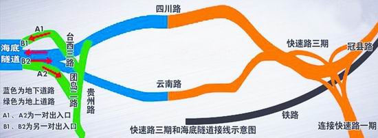 很多市民很疑惑,是不是海底隧道只能連著快速路三期?記者探訪發(fā)現(xiàn),海底隧道不只可以連快速路三期,連接的道路挺多。