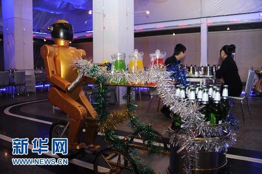 12月27日,一個送酒水的機器人在餐廳服務(wù)。新華社記者徐速繪攝