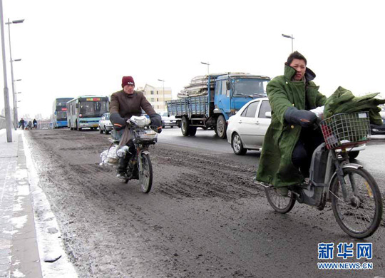12月23日,兩名市民騎車在濕滑的路面上前行。岳月偉 攝
