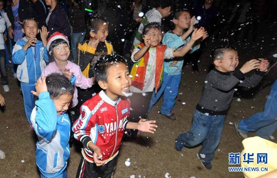 12月24日,孩子們興奮地在“雪花”中嬉戲。郭程 攝