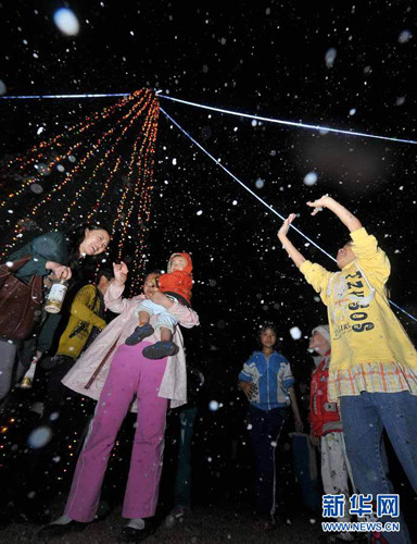 12月24日,市民和游客興奮地在“雪花”中嬉戲。當(dāng)日是平安夜,??谑邪咨抽T公園內(nèi)的飄雪裝置吹起紛紛揚(yáng)揚(yáng)的雪花,讓市民和游客體驗(yàn)到了濃濃的北國風(fēng)情。郭程攝