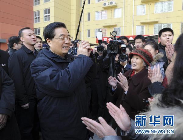 這是胡錦濤在朝陽區(qū)管莊路保障性住房常營(yíng)項(xiàng)目麗景園小區(qū)考察時(shí),向小區(qū)居民致以新春祝福。新華社記者 李學(xué)仁 攝