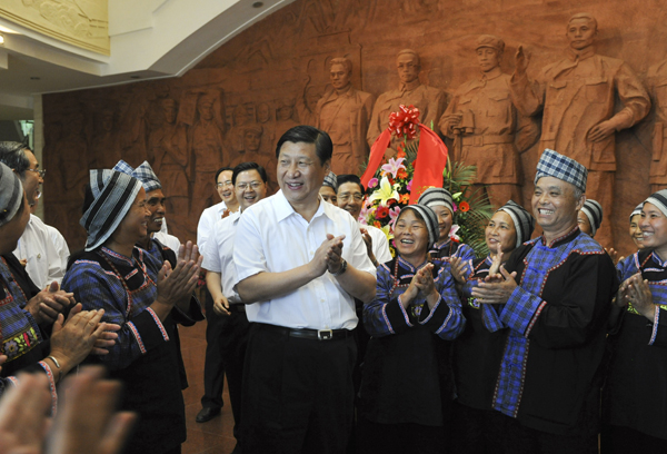 中共中央政治局常委、中央書記處書記、國家副主席習近平5月9日至11日先后到廣西壯族自治區(qū)百色市和南寧市調(diào)研。這是5月9日,習近平在參觀百色起義紀念館時與紅軍后代和親屬親切交談。新華社記者李學仁 攝