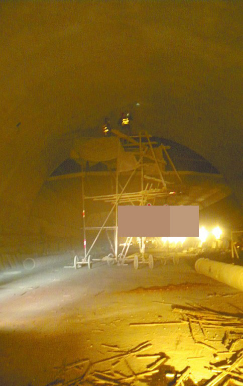 ????一路還算順暢,路上沒有遇到大的阻礙,在隧道中間部位,因為施工原因,一輛高臺架橫在道路中央,兩邊放著設備材料,汽車慢速行駛。