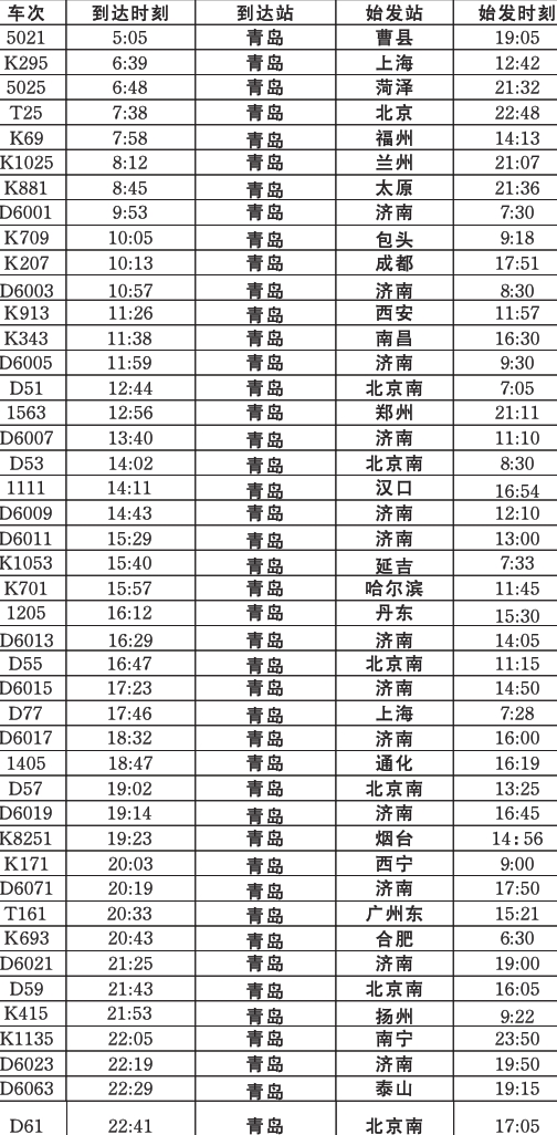 ??? 1月11日零時起,全國鐵路開始實(shí)施新的列車運(yùn)行圖。記者1月1日采訪了解到,濟(jì)南鐵路局在此之前公布了新的鐵路運(yùn)行圖調(diào)整公告,根據(jù)公告,1月11日新的鐵路運(yùn)行圖調(diào)整后,進(jìn)出青島的29趟列車停站情況有變,而且膠州北站將正式啟用,四趟列車在此停站。同時1月2日,青島火車站公布了新的列車時刻運(yùn)行表,自1月11日起開始執(zhí)行,有出行打算的市民可要看好了。