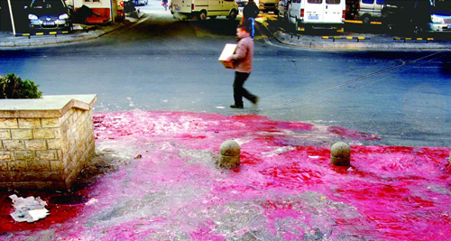 ???1月6日上午8時(shí)許,在撫順路蔬菜副食品批發(fā)市場南側(cè)的遼陽西路上,一大片“血冰”占滿了人行道,場景讓人驚心。盡管這些血水已經(jīng)結(jié)冰,但是血腥味還是撲鼻而來,行人只好被迫到車行道上行走。這些成片的血冰從何而來?