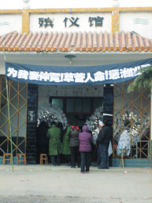 “沒有的事,我們從來就沒接受這一說法?!崩罾蛏暗囊幻従訐u頭對(duì)記者說。他指著殯儀館門口懸掛的寫有“草菅人命,懲治兇手”等黑色大字的白色橫幅介紹說:“我們?cè)跉泝x館住了三四天了,就是希望能夠有一個(gè)公道的說法,希望能夠懲治兇手,告慰死者。”