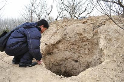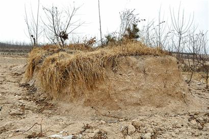 ????昨天上午10時(shí)許,記者來(lái)到膠南市土山屯村東面的“土山屯漢墓群”。在村民的指引下,記者在南面的一座古墓上看到,墓北側(cè)有一個(gè)直徑在一米左右的洞,洞體呈圓形,洞外還留有扒出來(lái)的土,附近還有幾塊表面為條紋狀的殘碎陶片。“這個(gè)洞口肯定是盜墓賊留下的,要不然誰(shuí)閑著沒(méi)事在上面挖洞?!蓖辽酵痛迕癖R老漢告訴記者,前一陣子他給麥地澆水的時(shí)候,這個(gè)地方還好好的,可是上個(gè)月他到地里查看旱情走到這里,就發(fā)現(xiàn)了這個(gè)洞口?!安坏绱耍?dāng)時(shí)洞邊還有一些干草和木棍,可能是盜墓賊在里面盜墓的時(shí)候,怕被人看到,就將洞口蓋住了?!北R老漢說(shuō)。