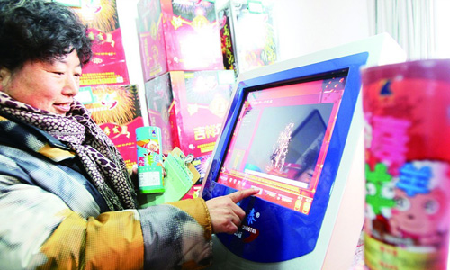 ???1月11日,紹興路一煙花爆竹批發(fā)店內(nèi),煙花爆竹零售商劉女士正在通過(guò)電子查詢(xún)系統(tǒng)查看煙花爆竹燃放視頻,該系統(tǒng)不僅可以查詢(xún)煙花爆竹的品種規(guī)格,還能直觀地看到燃放效果。(記者 何毅)