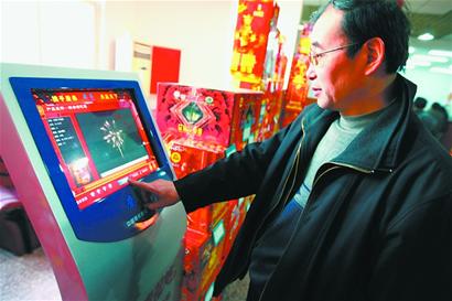 ????在批發(fā)大廳一角,一臺立式的觸屏機引起了記者的注意:觸屏機主頁面顯示“煙花爆竹查詢”,在“產品”頁面中標注有“組合煙花類、鞭炮類、焰火類、玩具煙花、吐珠類、噴花等七八個類別,記者隨機點擊了一個產品,再點“產品視頻”,屏幕便開始播放該種焰火燃放的效果。