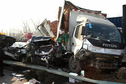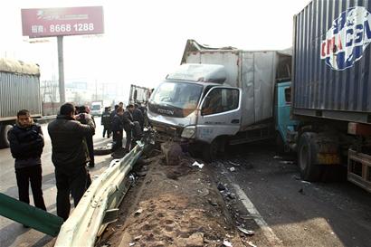 ???昨日上午9時許,隨著“咣”“咣”幾聲巨響,膠州灣高速公路距管家樓收費站百余米的路段,一輛集裝箱貨車因剎車失靈,接連撞上前方排隊的5輛車。廂式貨車慘遭“開膛破肚”,中間的本田和別克轎車分別被“斬頭”“去尾”,其余兩車受“輕傷”。幸運的是,事故沒有造成人員傷亡。昨日下午,記者從膠州灣高速公路交警大隊獲悉,經(jīng)現(xiàn)場勘查,肇事集裝箱車確系剎車失靈,負事故全部責任。