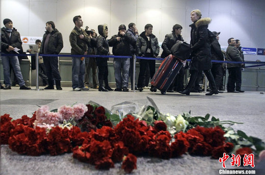 1月25日,俄羅斯多莫杰多沃機場大廳擺放鮮花哀悼在炸彈襲擊中喪生的遇難者。24日,俄羅斯莫斯科多莫杰多沃機場抵達大廳內(nèi)發(fā)生自殺式炸彈爆炸。
