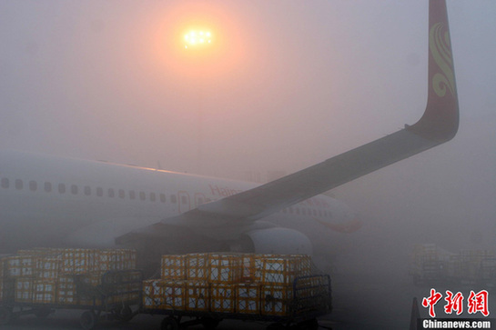 ????2月1日晨,一場大霧突襲成都平原,能見度最低時不足50米。成都雙流國際機場因大霧被迫關(guān)閉,造成大面積航班延誤或中途返航及備降其它機場,大量旅客被迫滯留機場。時值春運期間,這場大霧給雙流機場的客貨運輸帶來了極大的壓力。(中新社發(fā) 呂俊明 攝)