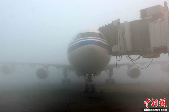 ????2月1日晨,一場(chǎng)大霧突襲成都平原,能見(jiàn)度最低時(shí)不足50米。成都雙流國(guó)際機(jī)場(chǎng)因大霧被迫關(guān)閉,造成大面積航班延誤或中途返航及備降其它機(jī)場(chǎng),大量旅客被迫滯留機(jī)場(chǎng)。時(shí)值春運(yùn)期間,這場(chǎng)大霧給雙流機(jī)場(chǎng)的客貨運(yùn)輸帶來(lái)了極大的壓力。(中新社發(fā) 呂俊明 攝)