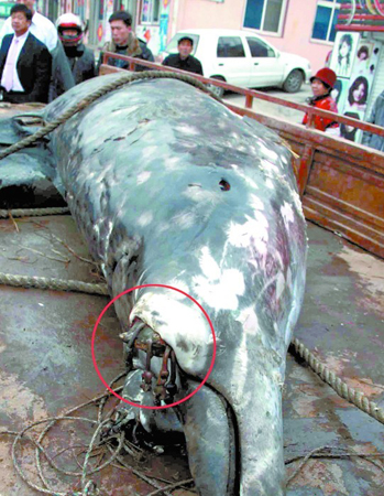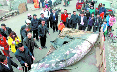 ????“這頭死亡的怪魚最低有2000斤重。”吳先生介紹說,他們把“怪魚”拉回社區(qū)后,很多居民聽說這頭巨大的“怪魚”擱淺膠州灣死亡后,都趕過來觀看,后來他們找來尺子,經(jīng)過丈量,發(fā)現(xiàn)這頭死亡的“怪魚”長達(dá)4.76米,“胸圍”約2.6米。