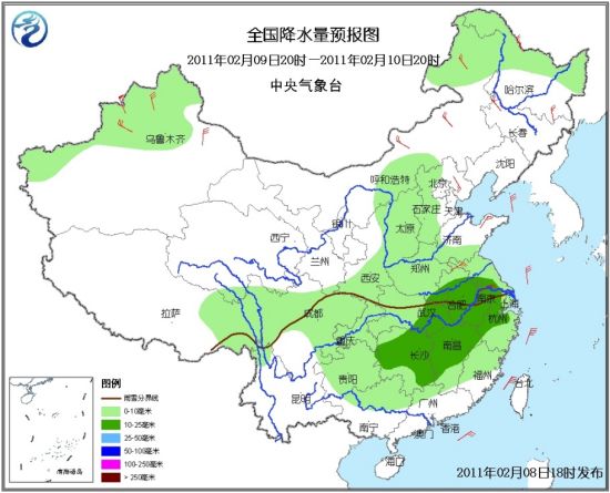 ????8日20時(shí)至9日20時(shí),新疆西部及天山地區(qū)、青海東部、內(nèi)蒙古東北部、黑龍江北部、西北地區(qū)東部、山西、黃淮西部、江淮大部、江漢、江南西部、四川盆地東部、貴州東部等地有小到中雪(雨)或雨夾雪;內(nèi)蒙古、東北、山東半島有4~6級(jí)風(fēng);渤海、黃海、東海將有6~7級(jí)、陣風(fēng)8~9級(jí)偏北風(fēng)。